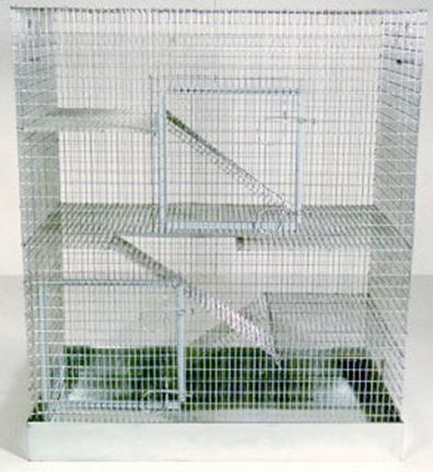 The cage itself should measure at least 24” x 24” x 24” for one chinchilla, larger for multiple chinchillas. A large, multi-level cage with lots of shelves and perches is best, since chinchillas love to run and jump. Ramps are not necessary and can actually be quite dangerous. A chinchilla can get its foot stuck in the ramp, causing the bones in the foot or leg to break. The chinchillas will jump from shelf to shelf and actually enjoy doing so. Shelves should be made of kiln dried pine or poplar since the chinchillas will chew on them. The sides and top of the cage should allow for plenty of air circulation. Wire spacing should not exceed 1” x 1”. Cages with wire floors or levels areacceptable, though many people prefer to replace the wire shelves withwood.