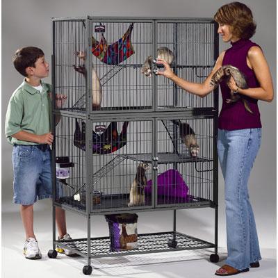The Ferret Nation cages come with plastic pans that need to be replaced with metal pans. These can be ordered from Bass Equipment. The wire shelves and ramps in both the Ferret Nation and the Martin’s cages can be removed and replaced with wooden shelves. They can also be covered with wood, tiles or fleece in order to give the chinchilla a place to rest its feet.
