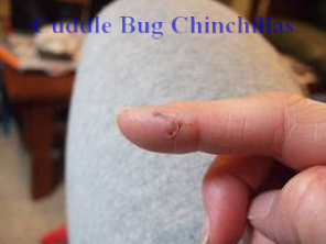 Biting is different from nibbling or grooming. It is either a defensive or aggressive act. A frightened or angry chinchilla will bite. This can happen when a chinchilla is new, pushed too far, not properly socialized, mistreated, or fighting with another chinchilla. A chinchilla bite can be quite severe and is very painful. As soon as possible, thoroughly clean the wound and apply an antibiotic ointment. If the bite does not stop bleeding, a trip to the doctor for stitches may be necessary.