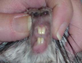 The photo on the right shows how the teeth lighten and turn white when the chinchilla is not receiving enough calcium. Chinchilla teeth should be checked regularly to ensure that they are the proper color. If the teeth are white, light yellow or striped, consult with a veterinarian as to the proper course of action to correct the deficiency. Even with proper nutrition, the chinchilla can experience dental issues. If the chinchilla is fed treats that are sticky or contain a lot of sugar, dental caries (cavities) can occur, causing tooth loss and other problems since the teeth will move within the mouth, attempting to fill in the gap.