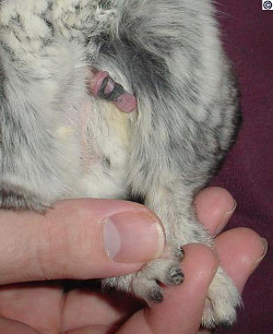 Remember, hair ring checks should be done at least once a month. They should never be skipped even if your male cleans the area himself. Any time a male chinchilla has trouble urinating (squeaking or grunting while urinating), exhibits a change in habits (urinates on the shelves when he previously did not doe so), or cleans the area excessively, he should be checked for a hair ring.