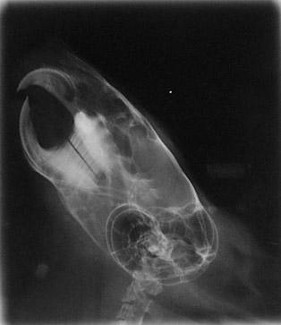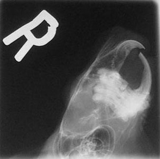 As can be seen, there is a major difference between the chinchilla with normal teeth and the one with malocclusion. The normal x-ray shows teeth meeting in a straight line with little or no curving of either the teeth or the roots. There is no evidence of the roots growing outside of the jaw line.