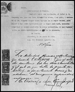 During their long trip, the chinchillas traveled by train from Poterillos, Chile to the coast. After a stay designed to allow the chinchillas to acclimate, they were transported by the steamer, Palena to Calloa, Peru. From there, they went by the steamship Anyu Maru to San Pedro, California where they arrived on February 22, 1923. During the trip, the chinchillas were given the same diligent care resulting in the loss of only one adult chinchilla and the birth of one baby. When boarding the ship, Mr. Chapman had his friends bring the chinchillas on board in their pockets. He waited until the ship was well out to sea to inform the captain that he had live animals aboard. After this disclosure, he was allowed to bring the cages up from the hold. He threatened the captain with a lawsuit if anyone interfered with the chinchillas. Mr. and Mrs. Chapman worked hard during the trip to keep the chinchillas cool with ice and cool, wet towels. The ice was placed in special compartments in the cages and the towels were draped over the cages.